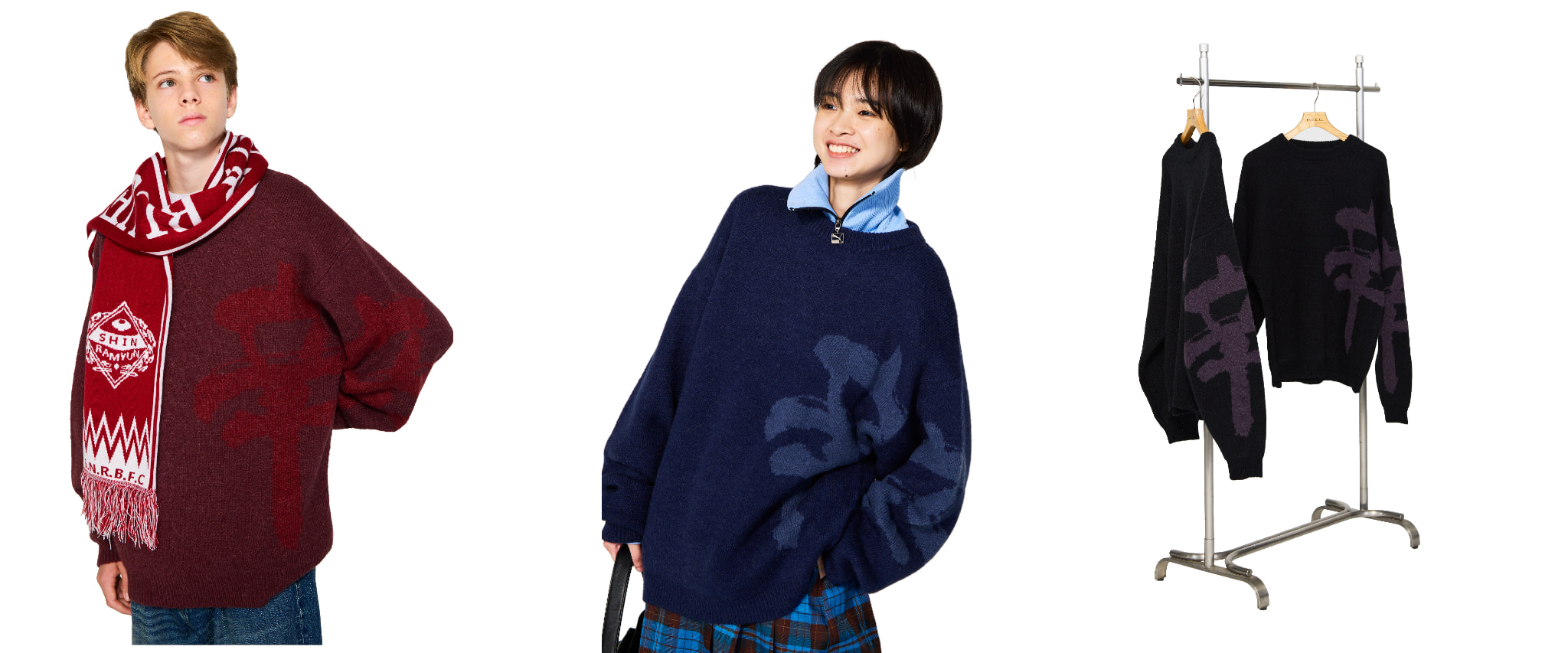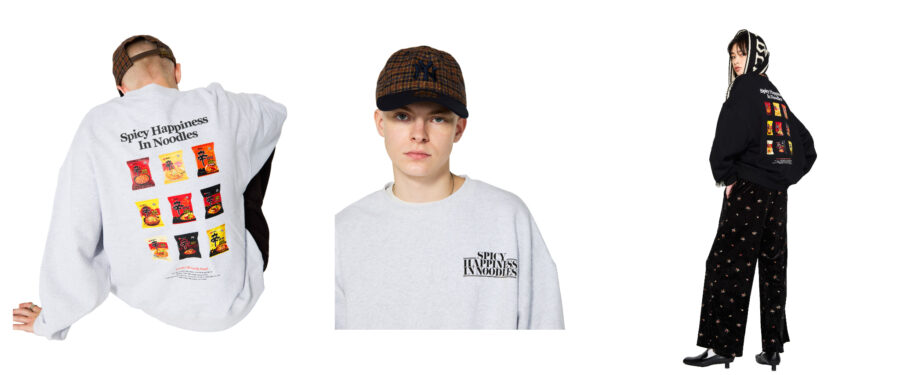 今回のコラボレーションでは、「辛ラーメン」のアイコニックなデザインを落とし込んだニットやスウェットなど、秋冬シーズンに活躍するアパレルアイテム全5 型を展開します。商品の詳細および販売情報は以下の通りです。