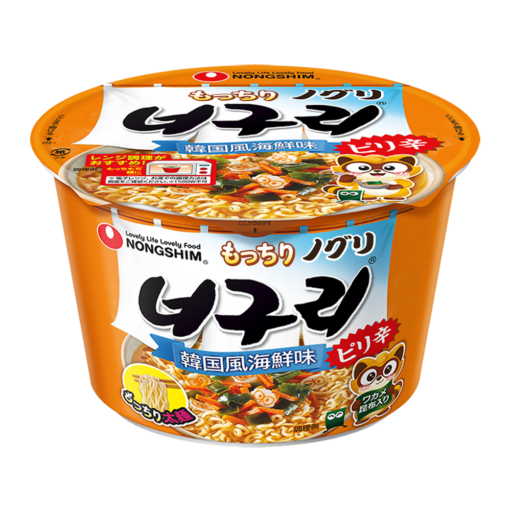 ノグリはコシのある太麺で、もちもちとした食感とうどんのような食べ応えが特徴的な海鮮ベースのラーメン。「ノグリ」は韓国語で「たぬき」のことで、丸くて太い麺の形がたぬきを連想させるということで名付けられました。実は辛ラーメンよりも長い歴史を誇るロングセラー製品で、辛いながらもスッキリとした味の「ノグリラーメン」や、辛さ抑えめの「ノグリラーメン マイルド」をはじめとした複数のラインナップを展開しています。