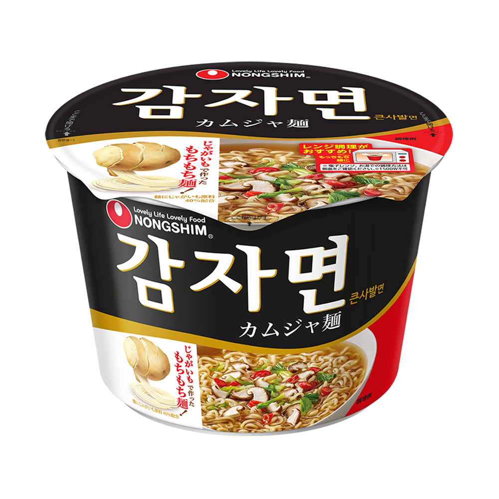 じゃがいも由来のもちもち食感の麺と、こしょうがアクセントのピリ辛スープが特長の「カムジャ(韓国語で“じゃがいも”)麺」。麺の 40%がじゃがいも成分でできており、そのもちもちとした食感とつるつるしたのど越し、そしてあっさりとした旨味で辛さ控えめのスープが、韓国ラーメン初心者にもおすすめ。同製品の袋麺タイプは、農心ジャパン全製品の中でも毎年売上 TOP10に入るほどの人気製品です(農心ジャパン製品売上食数実績 [2022-2024 年])