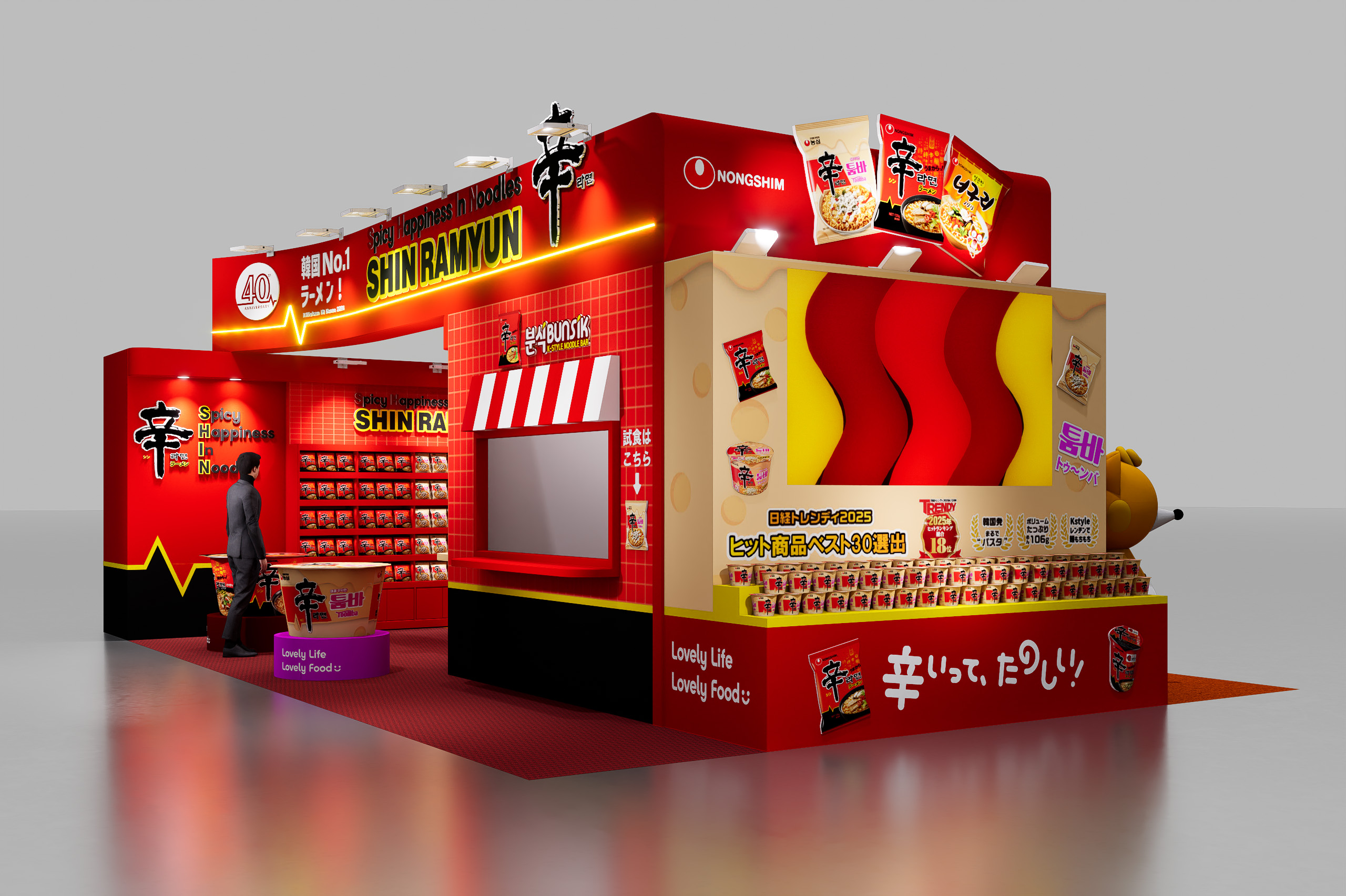 また、当社ブースの左側面と正面は、赤色を基調とした「辛ラーメン」デザインを施しており、40周年ロゴや新グローバルキャッチコピー『Spicy Happiness In Noodles』ロゴの掲載、人気沸騰中の「辛ラーメン トゥーンバ」を展示します。右側面には、ブランド初の日本限定製品を発売し、さらなるファン層を拡大している「ノグリ」を展示。より親しみやすくリニューアルを遂げたブランドキャラクター「ノグリくん」にも注目です。