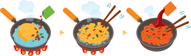 3. 火を止め、液体ソースを入れ、よく混ぜ合わせてお召し上がりください。
