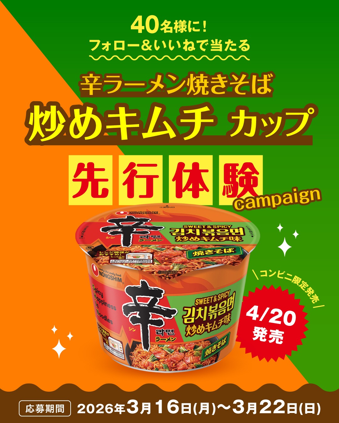 本製品の発売に先立ち、3月16日(月)からは先行体験キャンペーンを開催します。辛ラーメン公式Instagram・TikTok・Xをフォローし、キャンペーン投稿にいいね・リポストすると、抽選で合計120名様(各SNS 40名様ずつ)に新製品「辛ラーメン焼きそば 炒めキムチ カップ」を発売前に一足早くプレゼントします。