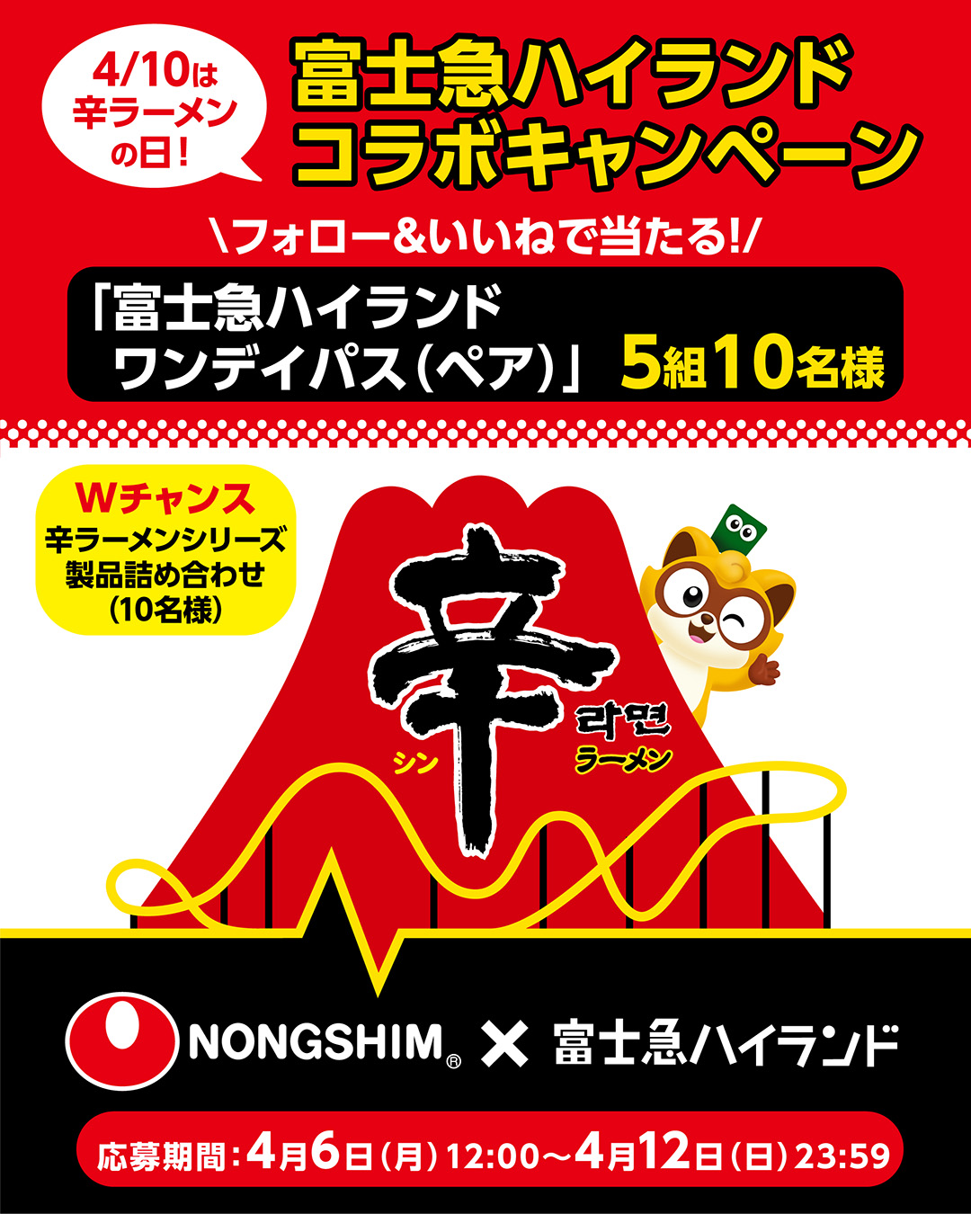 株式会社農心ジャパン(本社:東京都千代田区、代表取締役社長:金大廈)は、4月10日の『辛ラーメンの日』を記念して、富士急ハイランドとのコラボレーションSNSキャンペーンを開催します。4月6日(月)から4月12日(日)の期間中にX・Instagramから応募していただいた方の中から抽選で合計40名様に「富士急ハイランド ワンデイパス(ペア)」や「辛ラーメンシリーズ製品詰め合わせ」が当たります。