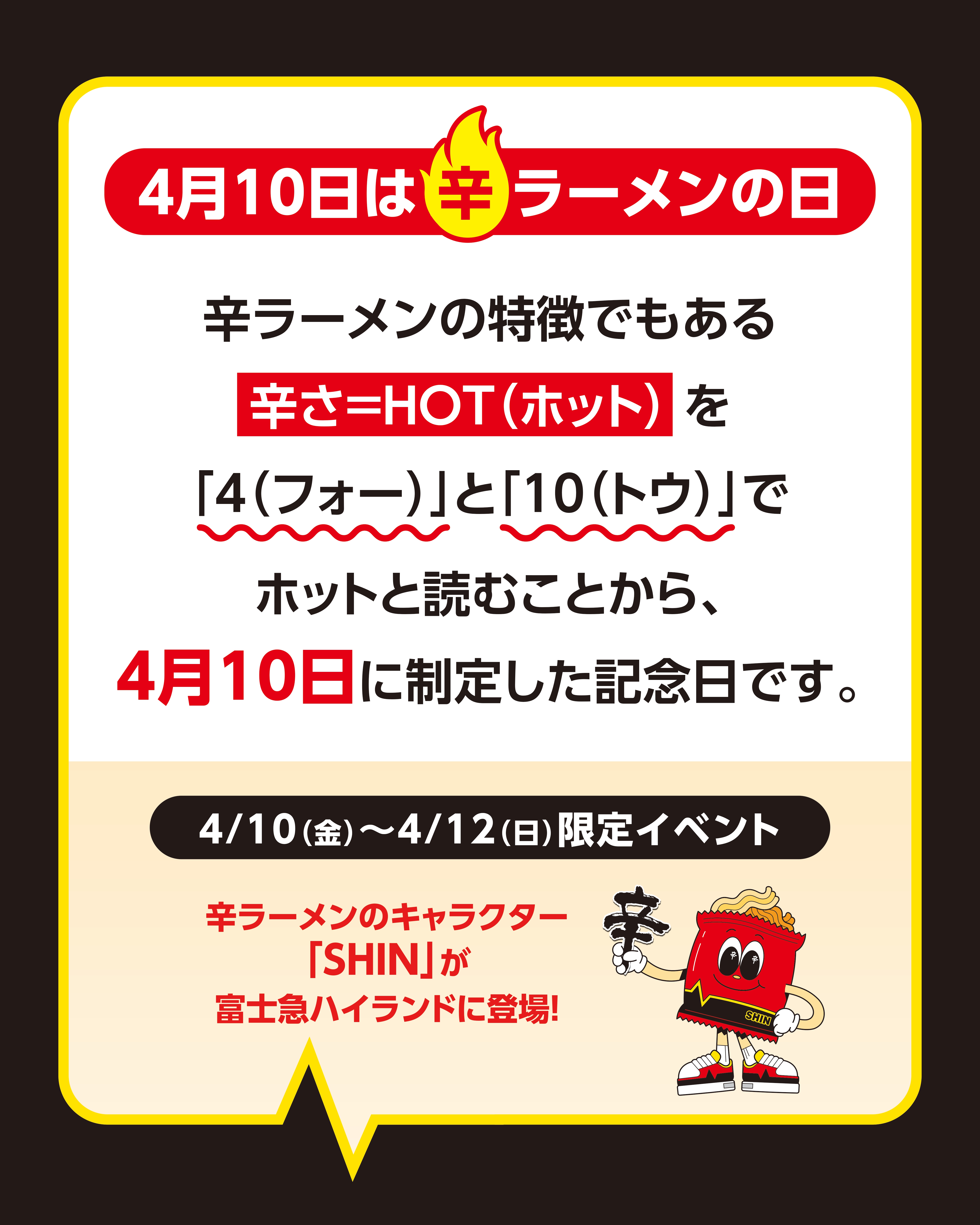 「⾟ラーメンの⽇」は、⾟ラーメンの特徴でもある「⾟さ=HOT(ホット)」を「4(フォー)」と「10(トウ)」でホットと読むことから、4⽉10⽇に制定した記念⽇です。1986年に誕⽣した「⾟ラーメン」は、様々なラインナップを取りそろえ、製品の特⻑でもある旨⾟さや、様々なアレンジレシピがSNSを中⼼に⼈気を博しています。