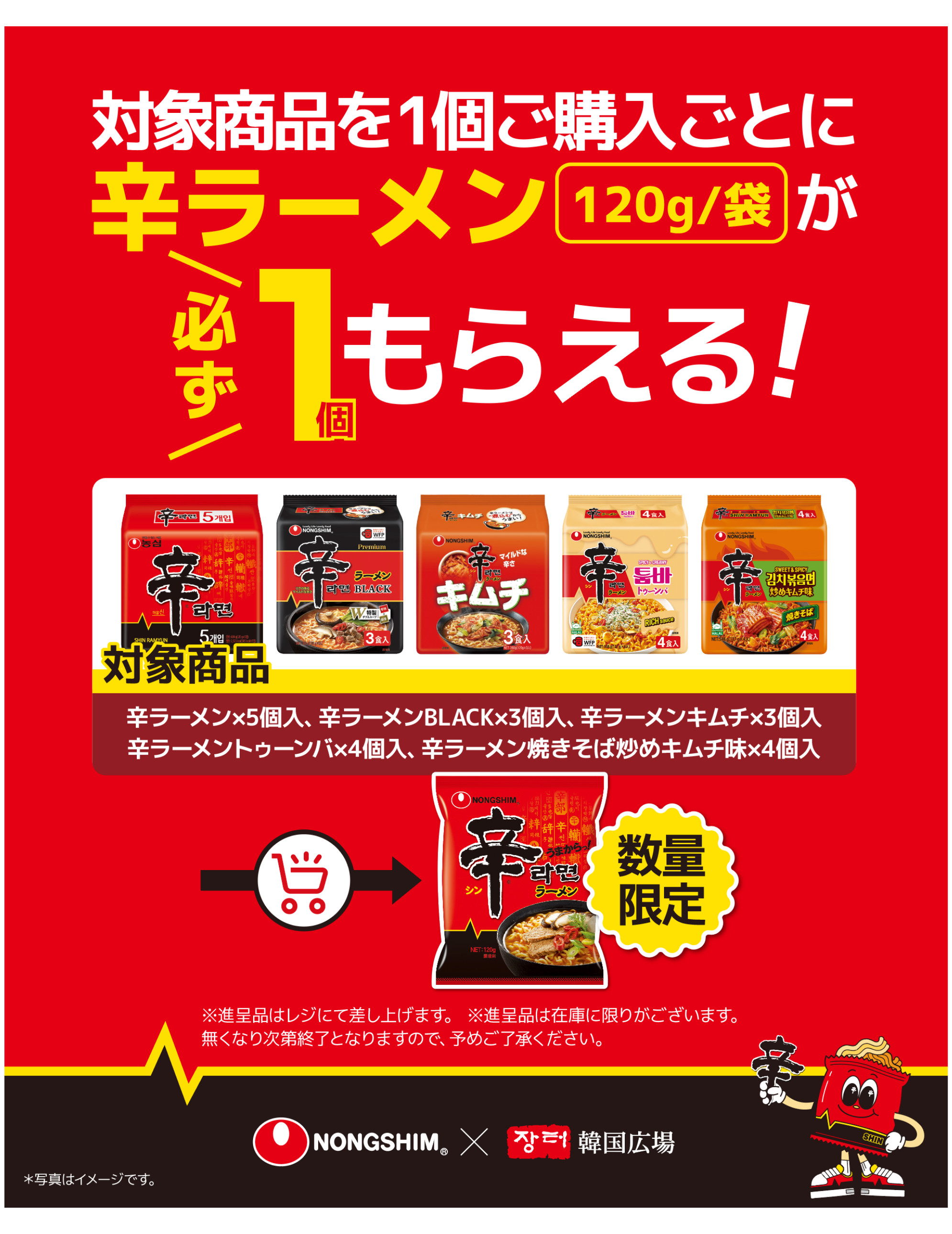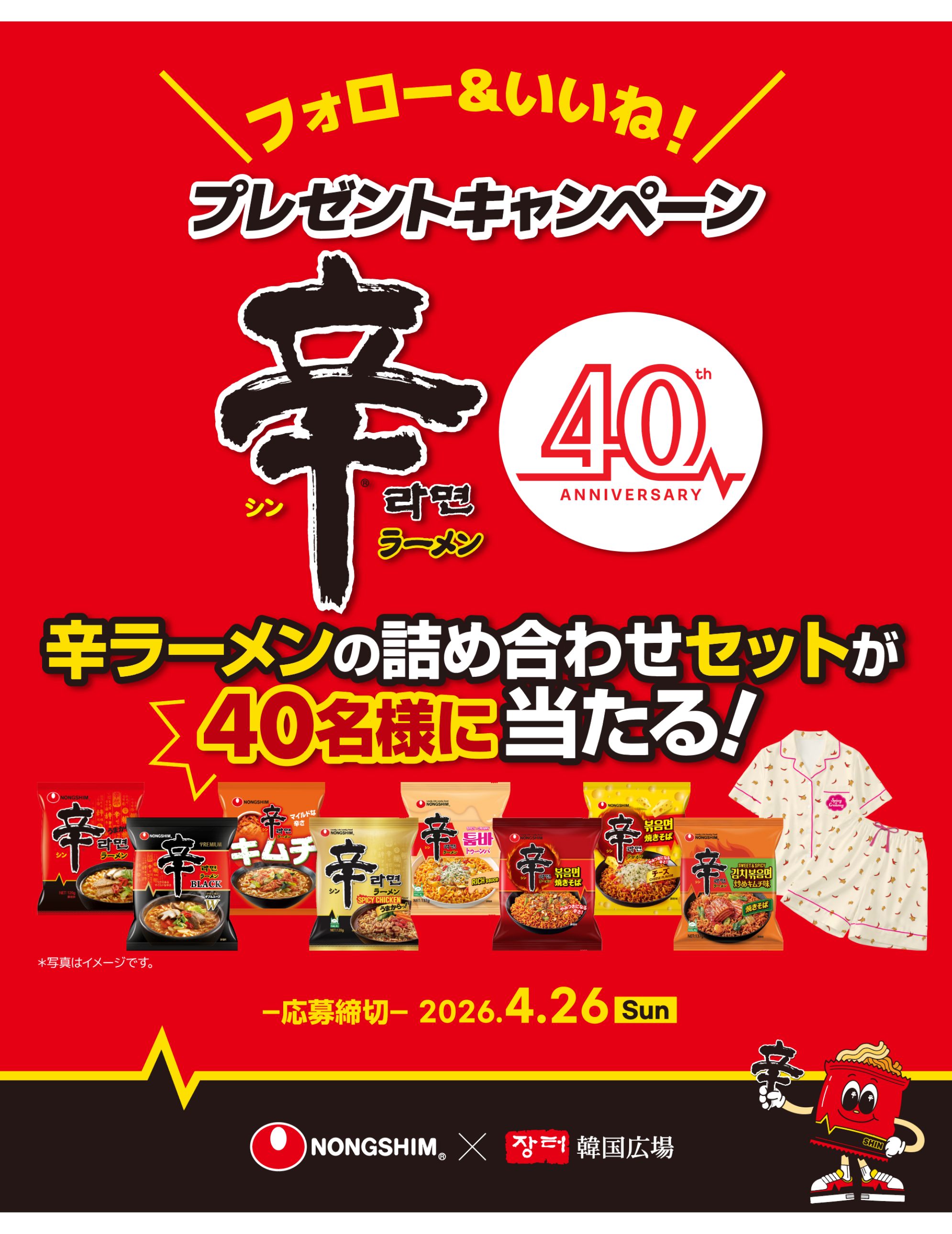 韓国の⽣活文化をサポートする⽇本一の韓国スーパー「韓国広場」では、“⾟ラーメン誕⽣40周年”を記念し、特別コラボイベントを開催します。期間中は、店舗が40周年限定デザインで彩られ、ブランドの世界観を存分に体感できる特設POP-UPコーナーや装飾で、店内を華やかに盛り上げます。また、対象商品を1個ご購入ごとに「⾟ラーメン(120g/袋)」が1個もらえるプレゼント企画や期間限定の特別割引セールも実施予定です。さらに、抽選で40名様に「⾟ラーメントゥーンバオリジナルルームウェア」と「⾟ラーメンの詰め合わせセット」が当たるSNSキャンペーンも同時開催し、記念すべき節目をたのしく演出します。