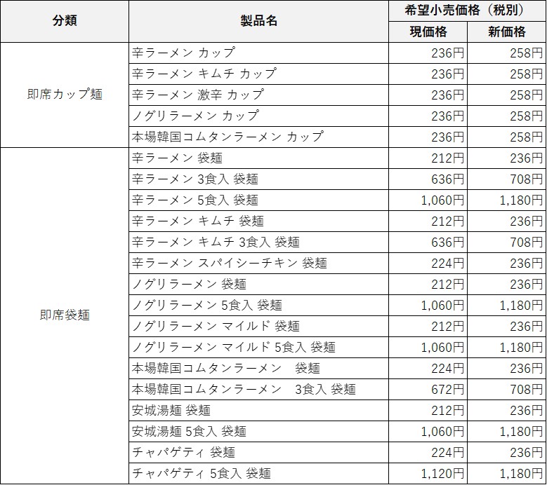 株式会社農心ジャパン(代表取締役社長:金大廈)は、この度、即席カップ麺・袋麺製品の価格を2026年8月1日(土)納品分より改定させていただきます。