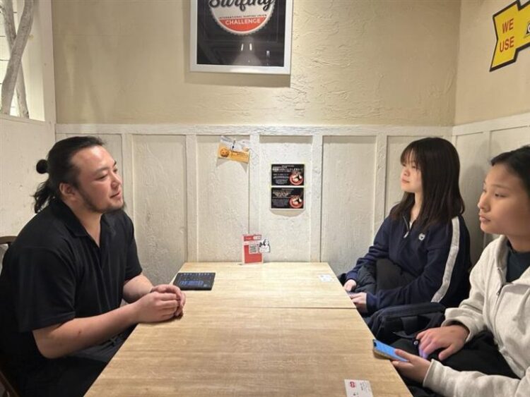 古賀店長(左) / インタビュアー(右から2人目:工藤 さくらさん 右端:水上 咲実さん)