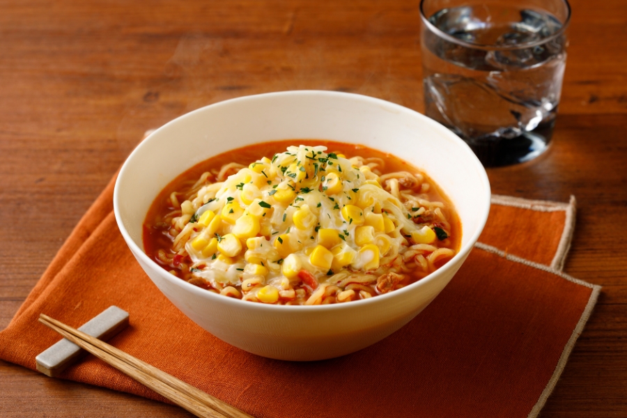 韓国の定番&人気おつまみ「コーンチーズ」をたっぷりのせた、背徳感のある辛ラーメン! 簡単、且つ、間違いないこの味は、思わず深夜に食べたくなる!?
