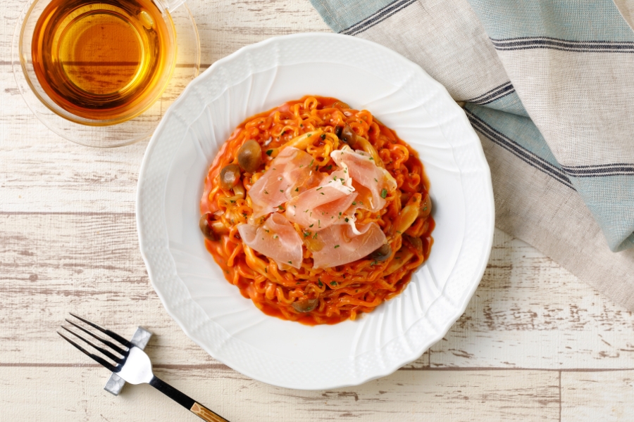 週末のブランチにもピッタリな「トマトクリームパスタ」風アレンジ。トゥーンバのSPICY&CREAMYな味わいに、パスタとの相性抜群な生ハム&きのこがベストマッチ!