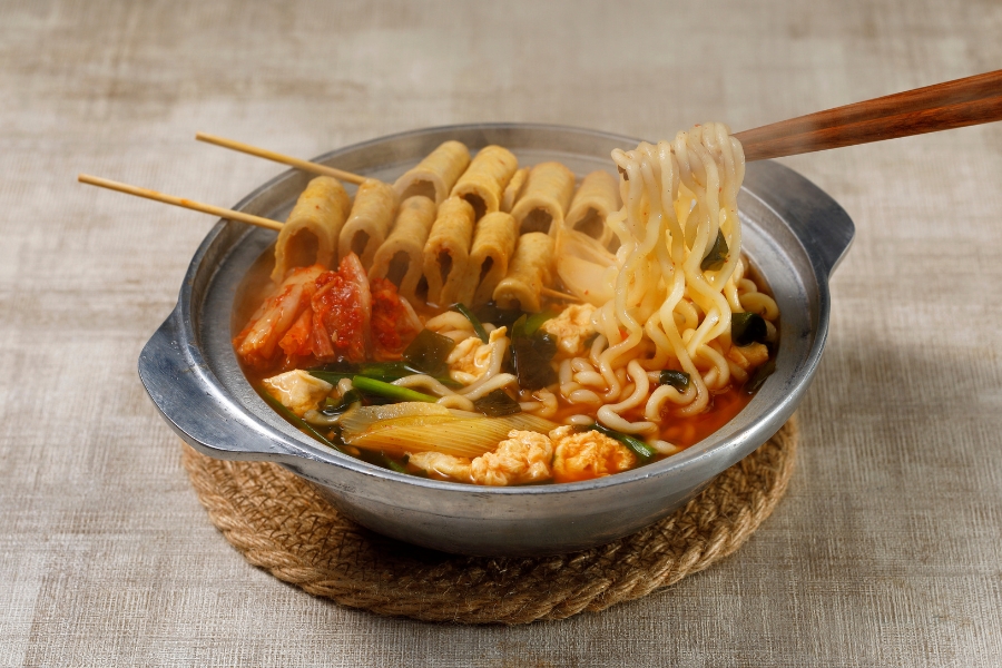 オムク(韓国おでん)入りの「キムチうどん」風ノグリ。海鮮ベースのノグリのスープに、キムチやコチュジャンの旨味が加わり、手軽ながらも本格的な味わいに!